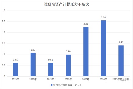 在各类信用资产高企的背景下,公司不断面临资产减值压力。今年前三季度,公司计提资产减值准备1.41亿元,2024年计提资产减值准备2.54亿元,2023年计提2.25亿元。从公司经营业绩来看,2021年以来设研院归母净利润持续下滑,计提资产减值正成为公司业绩“杀手”,吞噬着公司的利润。