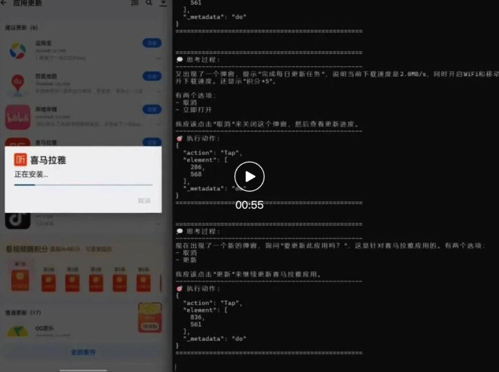 哇哦!真省心。简直是「懒人福音」。面对一大堆待更新的 App 和时不时的弹窗,AutoGLM 耐心地一个个点击。