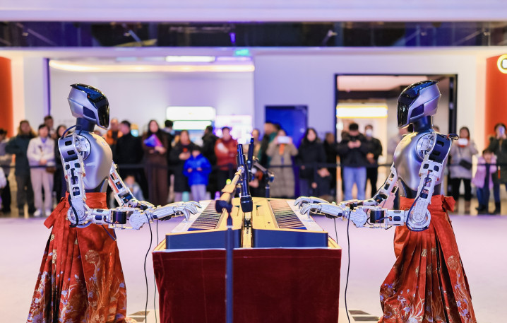 除了硬核科技,以《长河寻光·龙马精神》为主题的开幕式吸引了市民游客的驻足。“AI数字长河”宣传片首发,紫竹院街道IP“紫小息”以北京版清明上河图、桨声灯影等画面营造出沉浸式古典美学体验,展现紫竹院街道“水脉、文脉、人脉”的交融共生,诠释“人机共生·青年共创”的国潮新篇章。现场更邀请中央民族大学学子和灵心巧手机器人四首联弹共同和鸣AI主题曲《寻光者》;中央民族歌舞团舞剧团和宇树机器人共同舞动《骏马归来》。由光谷东智与北京舞蹈学院联合打造并获得“2025世界人形机器人运动会”金牌的大型人机共舞节目《秦俑魂》首次亮相街区。